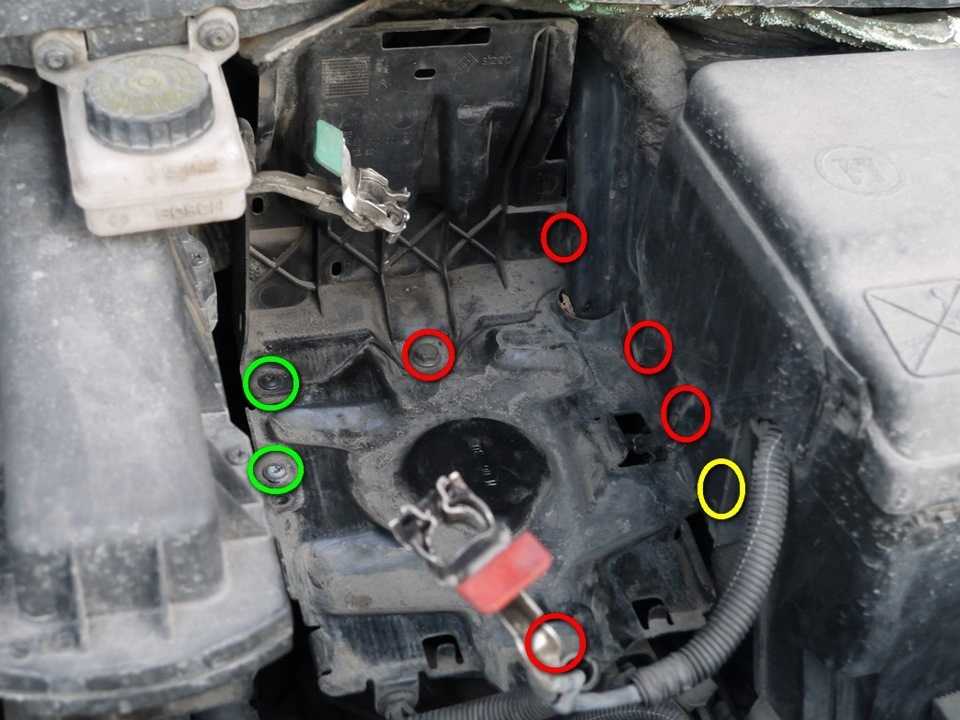 Итак, приступаем к снятию. Сначала нам нужно подготовить место для работы и доступа к болтам.Снимаем АКБ, снимаем площадку АКБ (чтоб её снять, нужно открутить 5 болтов на 13, обозначенными на фото красным цветом и два болта при помощи торкс 30 (зеленым обозначены), желтым обозначен болт, который необходимо выкрутить со стороны подкрылка, если таковой имеется.