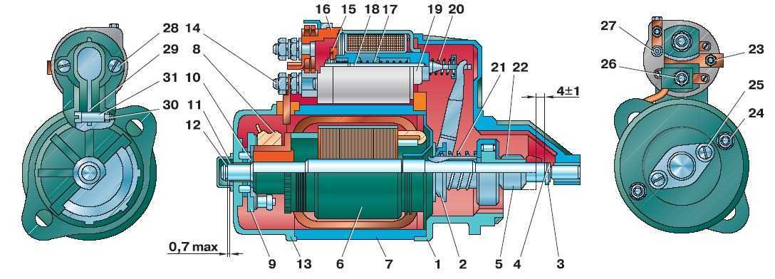 Рис. 7.18. Стартер 42.3708: 1 – крышка со стороны привода; 2 – поводковое кольцо; 3 – упорное кольцо; 4 – замковое кольцо; 5 – привод; 6 – якорь; 7 – корпус; 8 – щетка; 9 – траверса; 10 – упорная шайба; 11 – регулировочная шайба; 12 – стопорная шайба; 13 – крышка со стороны коллектора; 14 – контактный болт; 15 – контактная пластина; 16 – крышка реле; 17 – возвратная пружина; 18 – шток; 19 – якорь реле; 20 – компенсирующая пружина; 21 – буферная пружина; 22 – шестерня; 23 – винт М5х14; 24 – гайка стяжной шпильки; 25 – винт М6х16; 26 – гайка М8; 27 – ввод катушек реле; 28 – винт М6х30; 29 – рычаг; 30 – гайка М8; 31 – ось рычага |
