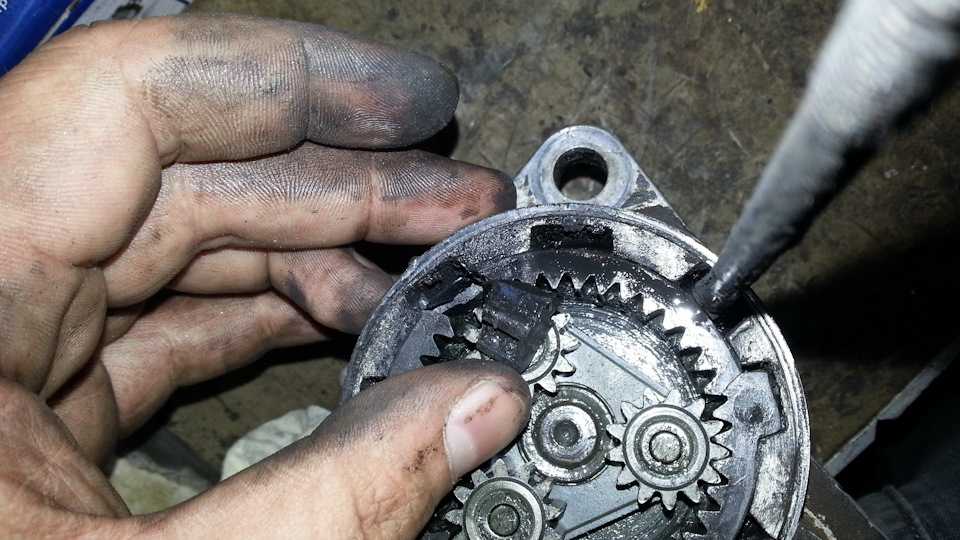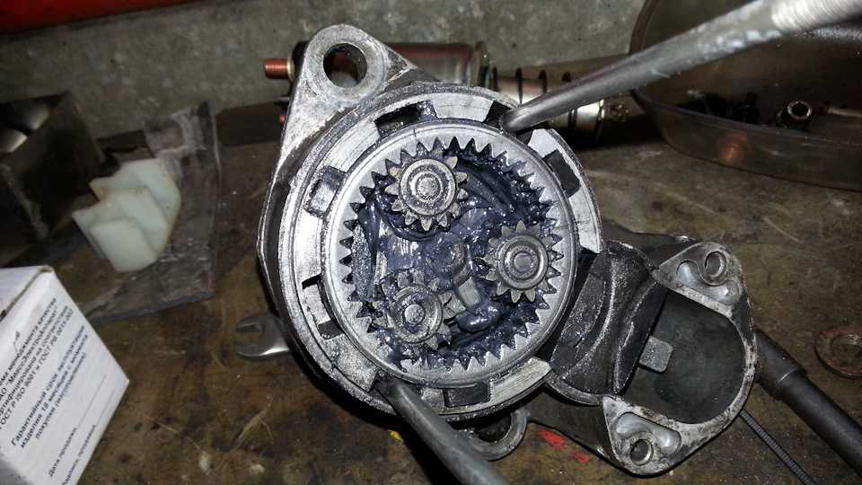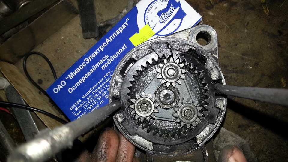 - Затем можно убрать удалить планетарные шестеренки, которые находятся на редукторе и его снимают со стартера. Но шестеренок может быть разное количество, три или четыре. Если их 4, то необходимо в самом начале снять центральную, и после этого все остальные легко снимутся. Не стоит забывать, что их тоже нужно тщательно осмотреть, чтобы не было зазоров, ржавчины, иначе их