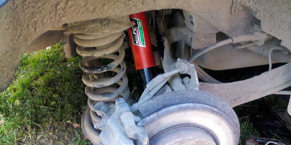 Во-первых, вам предстоит прогнать машину на лифте, приямке или поднять на лифте. Далее следует установить стяжку на пружины и максимально сжать их. Вы не можете удалить их, но в этом нет необходимости. Поднимите основной рычаг, который установлен на колесе, с помощью домкрата и снимите болт крепления рычага под пружиной.
