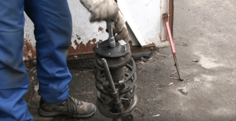 - Иногда источником удара является свисающее перо. Для устранения дефекта разбираем заднюю стойку. Снимаем амортизатор, пружину, опорный подшипник, опорную чашу.
