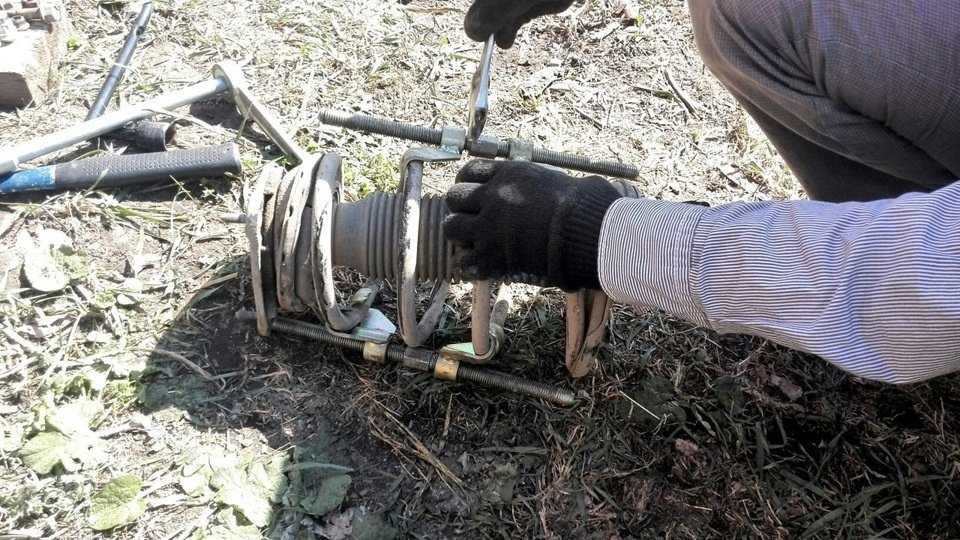 - Устанавливаем новую пружину, проводим дефектовку амортизатора, проверяем герметичность цилиндра. Собираем конструкцию обратно, проверяем правильность работы тяги задней подвески. Замените резиновые втулки проушины амортизатора.