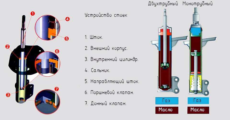Амортизаторы бывают с однотрубным и двухтрубным вариантом исполнения. При колебании поршень, расположенный в колбе, выдавливает амортизирующую жидкость в специальные каналы. Амортизаторы однотрубного типа состоят из корпуса и рабочего цилиндра. В них газ и жидкость помещены в один резервуар. В таких стойках отсутствует клапан сжатия, поэтому функция управления сопротивлением возложена на поршень. Однотрубные устройства точнее стабилизируют автомобиль на дороге. В узле также может присутствовать дополнительная газовая камера компенсации, вынесенная в отдельную емкость. Амортизаторы состоят из: