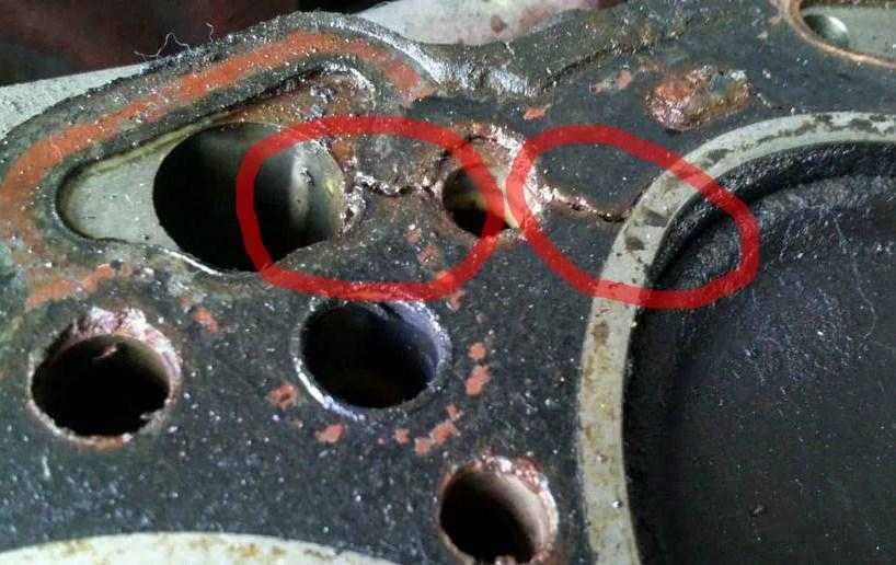 Ответственное соединение устанавливается по строго предусмотренной технологии. Однако в процессе эксплуатации и оно ослабевает. Прокладка уплотняется, стареет, головка деформируется от температуры и давления газов, мощные болты растягиваются, ослабевают хватку. Неисправность проявится в зависимости от того, какие отверстия соединяются, когда прокладка прогорает, рвется.