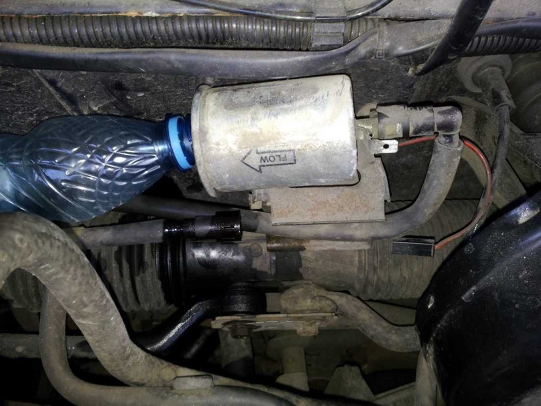 Со стороны двигателя снялся без проблем, но опять бенз потёк Чтоб не вытекал сделал так: АнтиБензоВытекатель С другой стороны было не особо удобно подобраться, да и сниматься шланг не особо хотел. Я открутил болт, держащий крепление топливного фильтра ключом на 10, снялось всё легко.