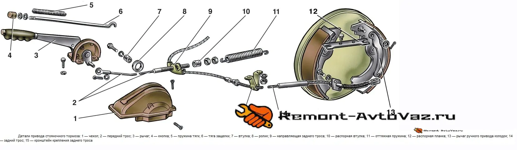 Под авто этот трос делиться на две части, идущие в механизмы задней оси. Внутри концы троса соединены с рычагом привода, а тот в свою очередь – с распорной планкой. Рычаг привода соединен с одной из колодок.