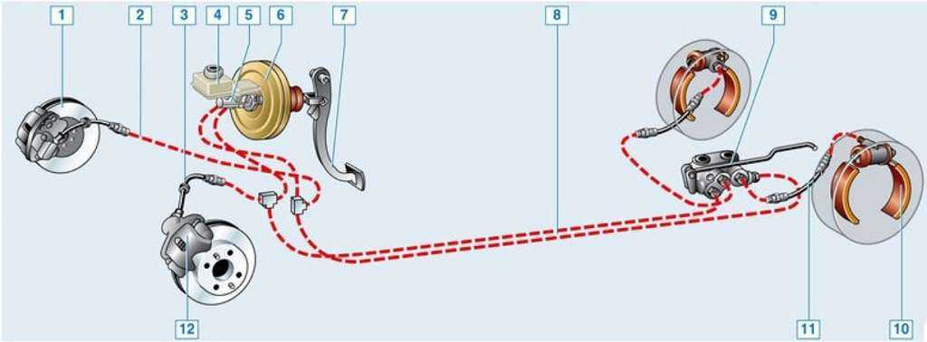Относительно конструктивных особенностей системы торможения, в том числе и Гранты FL, то для членов нашего гаражного сообщества с гуманитарным образованием приведем схему тормозов Лады Гранты, которая не имеет отличий от рассматриваемой нами модели АвтоВАЗа: