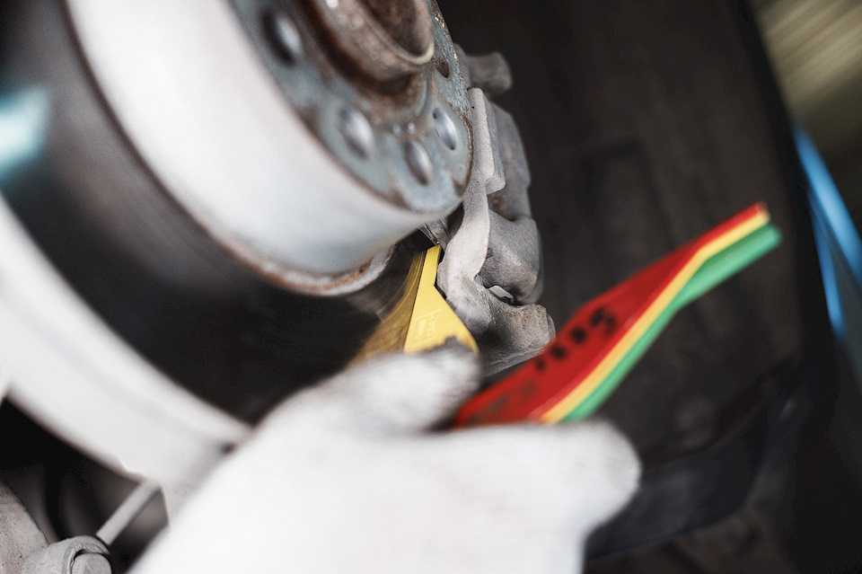 Толщина передних тормозных колодок обычно составляет 14 миллиметров, причём речь идёт именно о накладке феродо без учёта опорной пластины. 4 миллиметра это первый звонок, сигнальчик, рекомендованная, но ещё не обязательная мера, 2 миллиметра это уже набат, предел, за который лучше не переступать. Для измерения существует специальный набор щупов от 2 до 10 миллиметров с шагом через один, для пущей наглядности размеченные в цвета светофора.