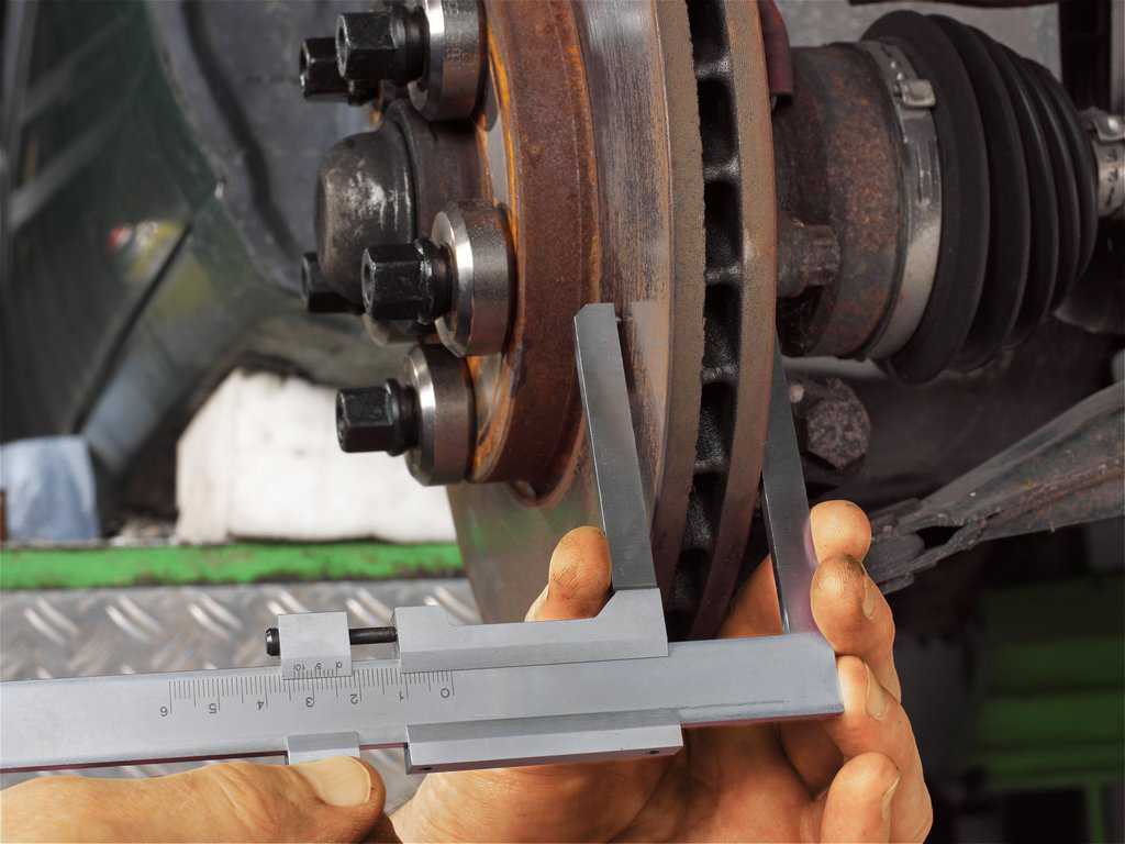На сервисе толщину дисков измеряют специальным прибором — это штангенциркуль, только он имеет меньшие размеры, а также на его измерительных губах имеются специальные бортики которые позволяют охватить диск не уперевшись в борт по краю диска.