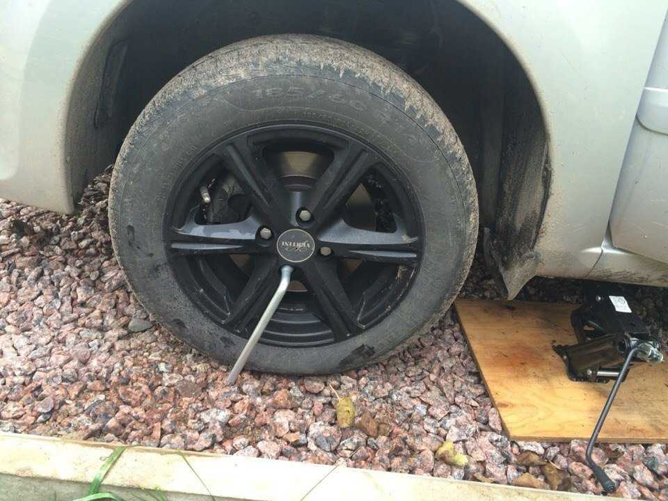 Затем ослабьте колесные гайки и поднимите автомобиль. Снимаем колесо.