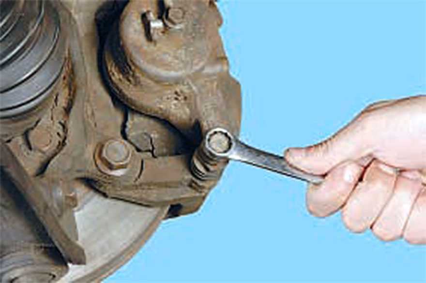 Откручиваем крепежный болт от направляющей суппорта. Используем большую трещотку с шестигранной головкой на 14 мм или рожково-накидным ключом на 14 мм.