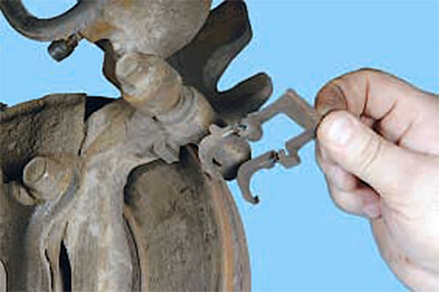 Процесс настройки суппорта (вращением поршня) удобно осуществлять специальными пассатижами. При необходимости уповысить зазор (разжать), вращение шляпки производят по часовой стрелке, при уменьшении – в противоположную сторону, откручивая ее. Установив суппорт и добившись необходимого зазора, контролируют вхождение в паз пупырышки на обеих сторонах.