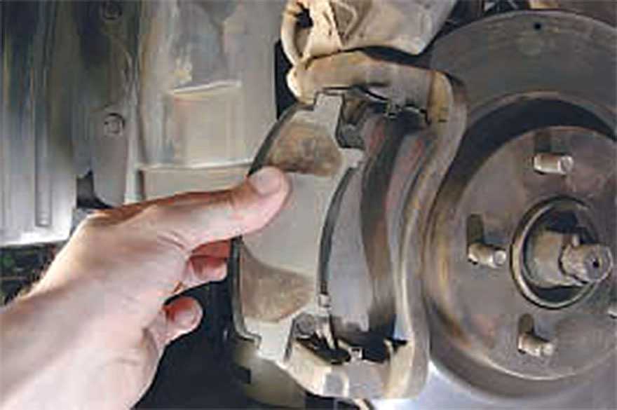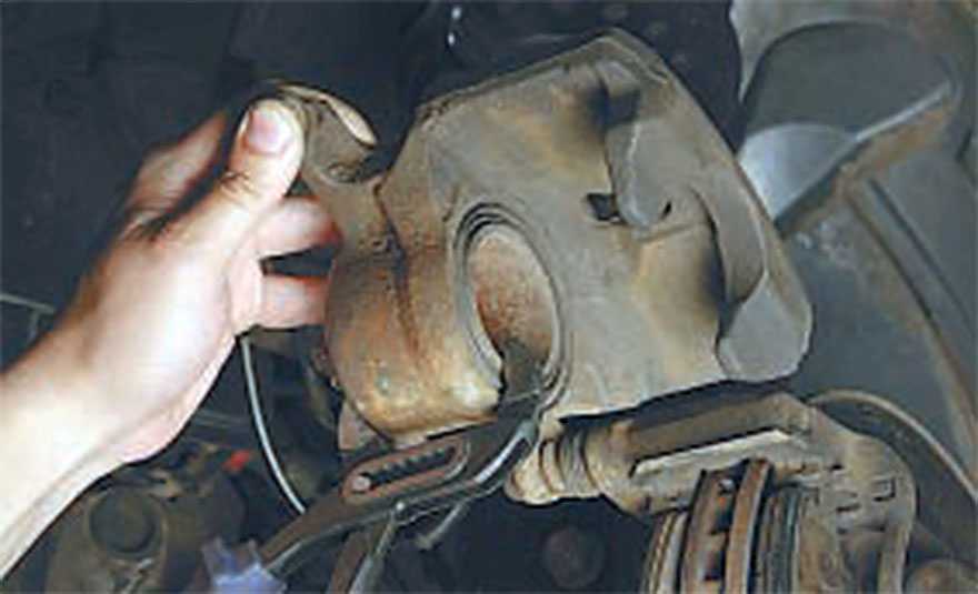 - Отжимаются и достаются из скобы тормозные колодки. Делать это нужно аккуратно, чтобы не повредить тормозной диск.