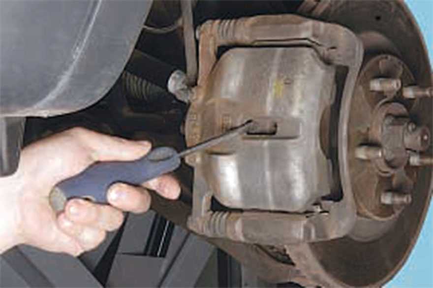 при наличии специальной смазки стоит обязательно смазать направляющие – при этом скоба суппорта должна быть аккуратно сдвинута в бок;
