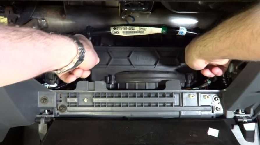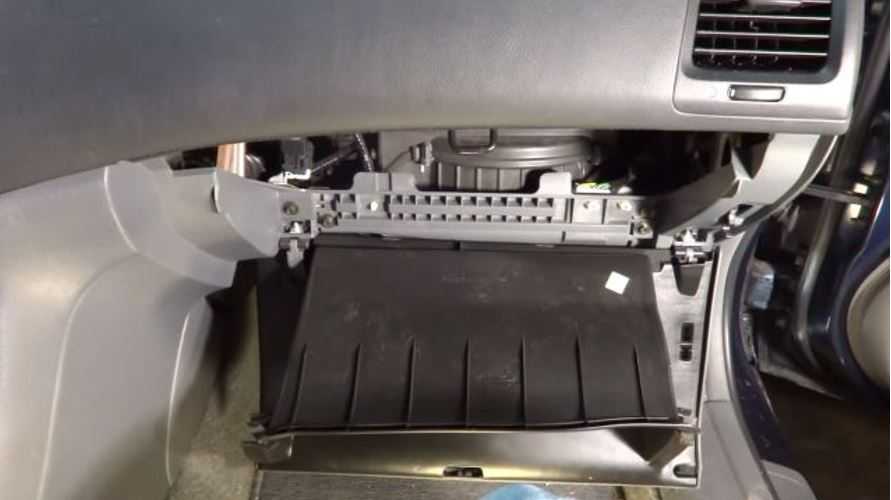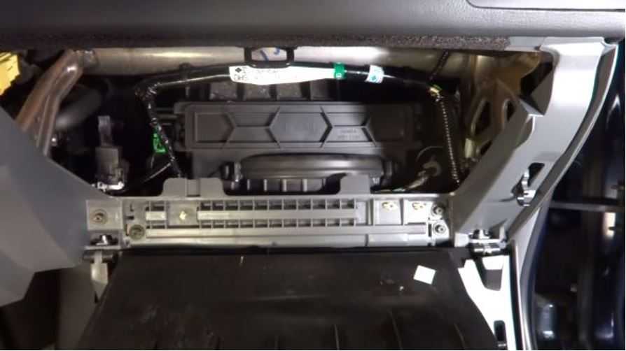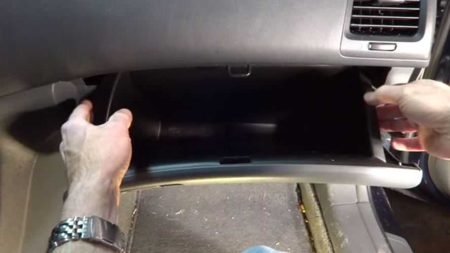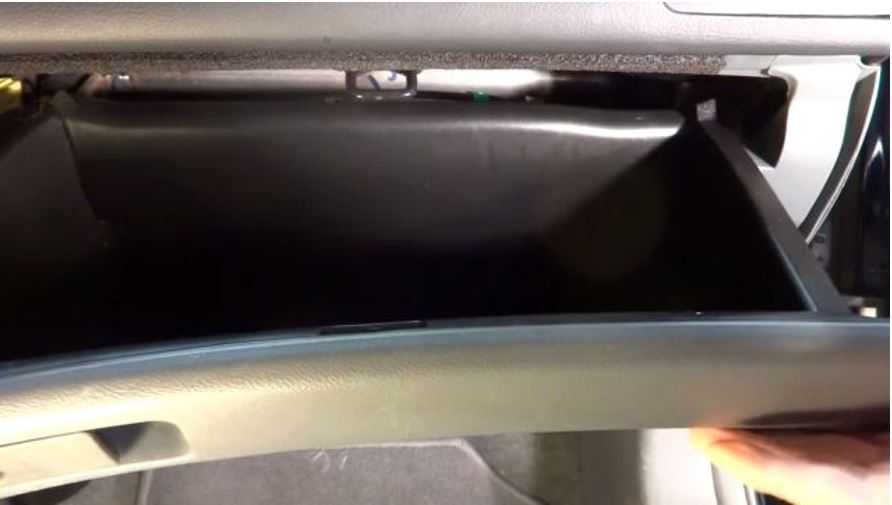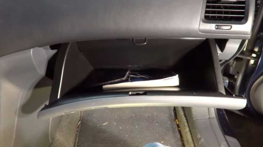 - Откройте бардачок, затем снимите последние шесть крепежных болтов, которые прикрепляют отсек к приборной панели.