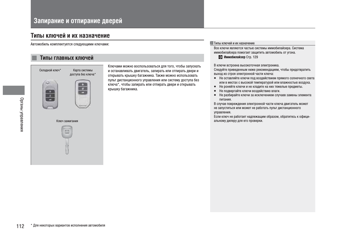 Ключами можно воспользоваться для того, чтобы запускать и останавливать двигатель, запирать или отпирать двери и открывать крышку багажника. Также можно использовать пульт дистанционного управления или систему доступа без ключа*, чтобы запирать или отпирать двери и открывать крышку багажника.
