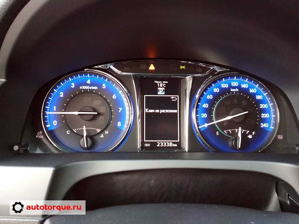 Приборная панель всех Toyota Camry 50 обтянута кожей и такое решение не только поднимает престиж авто, а также – исключает скрип пластика в салоне. Шумоизоляция на дорестайлинговых версиях слабенькая.
