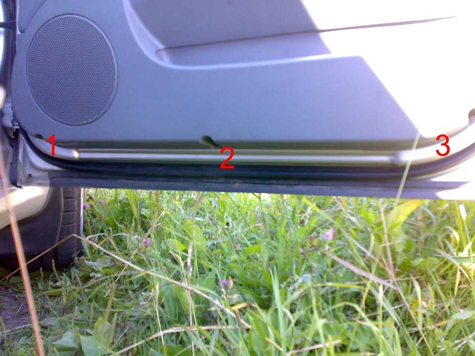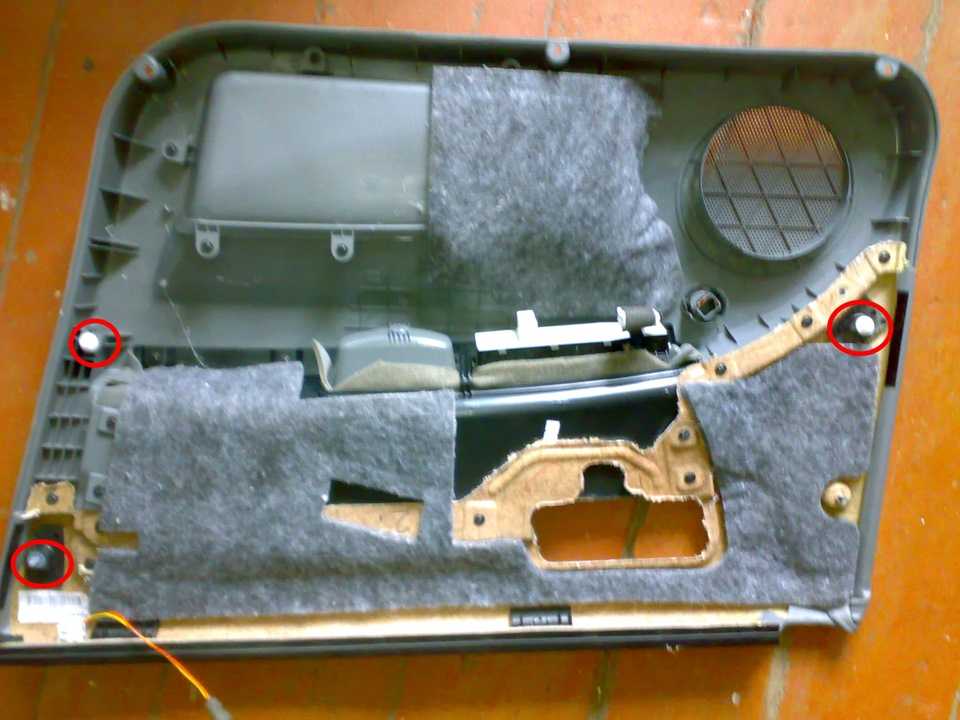 1. Внизу двери есть 3 болтика, откручиваем. 2. Ручку закрывания двери разединяем на 2 половинки (снимаем верхнюю), для этого с передней стороны ручки (чтобы было не видно если слегка подпортишь) в прорезь вставляем плоскую отвертку и разъединяем. (там даже специальные места под это дело есть где шов пошире) 3. В ручке еще 2 самореза. 4. дальше отщелкиваем клипсы (они побокам двери по 2 или 3 штуки) для этого засовываем пальцы под обшивку и тянем ее на себя пока не услышим КЛАЦ. это отщелкнулась защелка. 5. Теперь нужно акуратно снять пластмассовую коемочку вокруг ручки открывания замка двери (хромированной). Тут есть 2 спопоба: 5.1. Так мне делали на СТО. Просто сильно тянут за обшивку, эта рамочка изгибается и отлетает. Так мне сломали 2 защелки (их там. 7 или 6 не помню точно, 2 сверху 2 снизу и одна впереди одна сзади кажется) 5.2. Акуратно подсовываем тоненькую отверточку в щель между пластиковой рамочкой и тем пластиком, что внутри (там где пальцы залазят когда тянешь за ручку). Отвертку подсовывать нужно с внутренней стороны рамочки а не с наружней. так на пальцах описать очень трудно, но снимается она просто. Не боясь пхуешь отвертку поддеваешь, тянешь, страшного ничего не отломается. 6. Дальше опускаем окно (так будет проще снимать обшивку) 7. Поднимаем задницу обшивки вверх, чтобы выташить из отверстия питюнчик, замыкающий двери. 8. После того как питюнчик оказался под обшивкой (естественно при этом держим ее в приподнятом положении) тянем обшивку на себя вытягивая ее из под косынки/уголка, где зеркало. 9. Вытянув (там тянуть сантиметров 10) акуратно ее придерживаем, поднимаем окно (если это понадобится, а я думаю понадобится) и отщелкиваем провод от кнопки стеклоподъемника (там разьем папа/мама с защелкой, снимается не трудно но жестко главное — не бояться) ВСЕ.