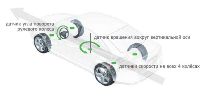 Когда данные акселерометра отличаются от информации, отображаемой датчиком движения руля, ESP начинает тормозить одно из четырех колес (иногда несколько), что позволяет устранить возможность заноса машины.