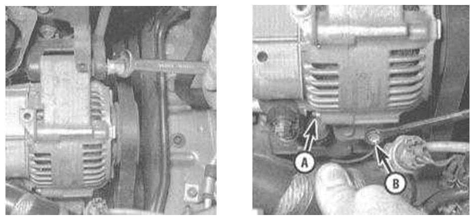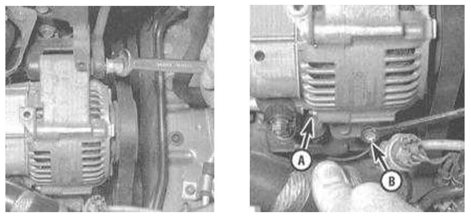 - Ослабляют осевой и регулировочный болт генератора. В 4-х цилиндровых конструкциях двигателей регулировочный болт находится параллельно ремню привода генератора и ослабляется путем ослабления действия контргайки. Модели с 6-тью цилиндрами имеют ленточный привод, который регулирует натяжение ремня автоматически.