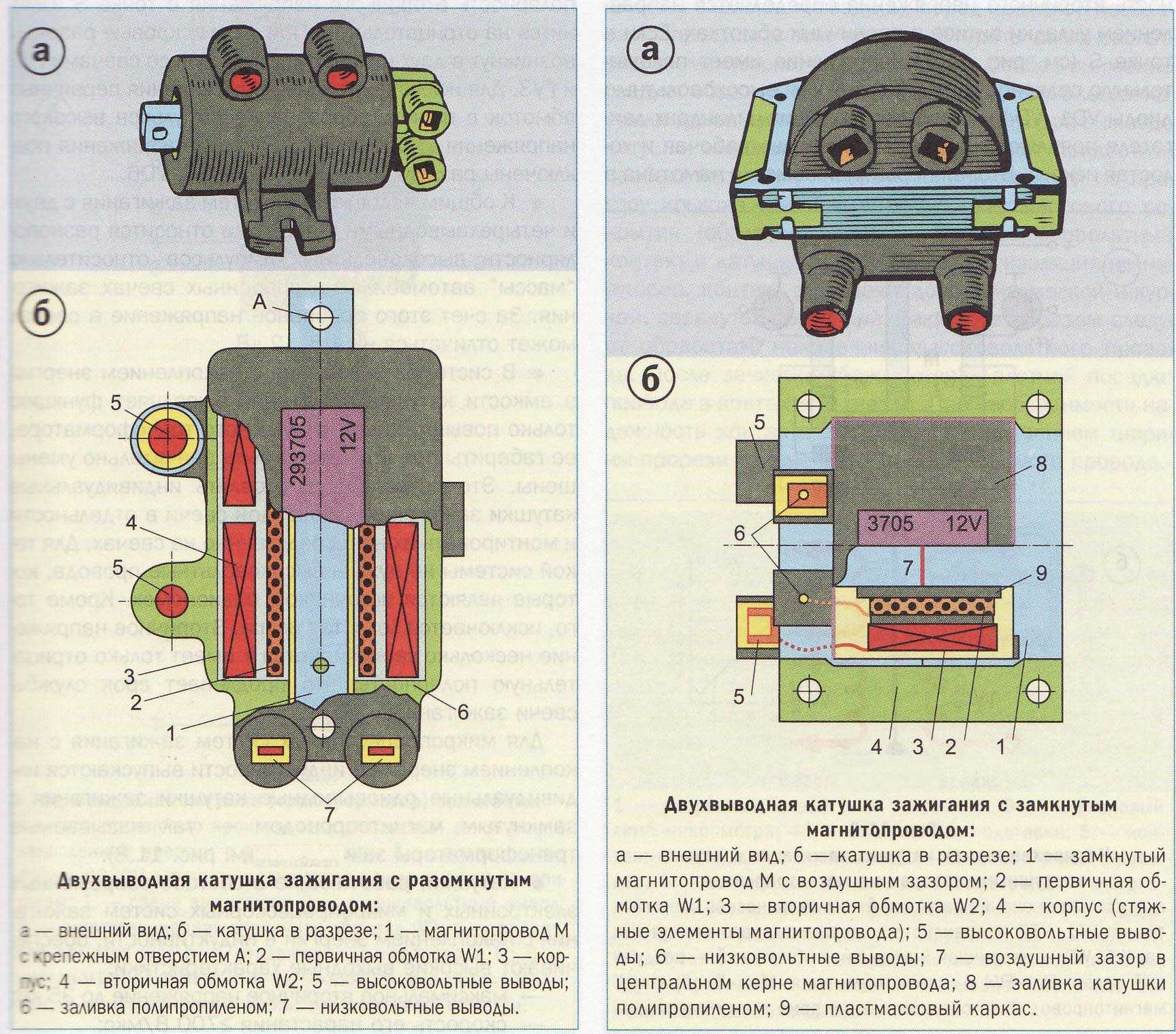 - Цилиндрическая катушка зажигания: первичная обмотка: 0,5–2,0 Ом, вторичная: 8,0–19,0 кОм.