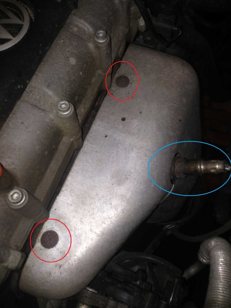 Демонтировать кислородный датчик, обведенный овалом голубого цвета, и выкрутить болты, фиксирующие термозащиту.