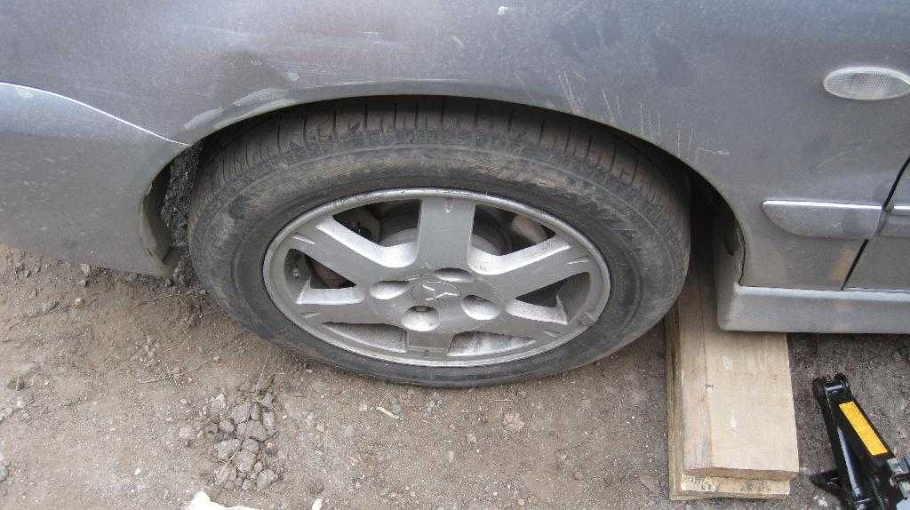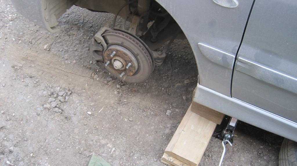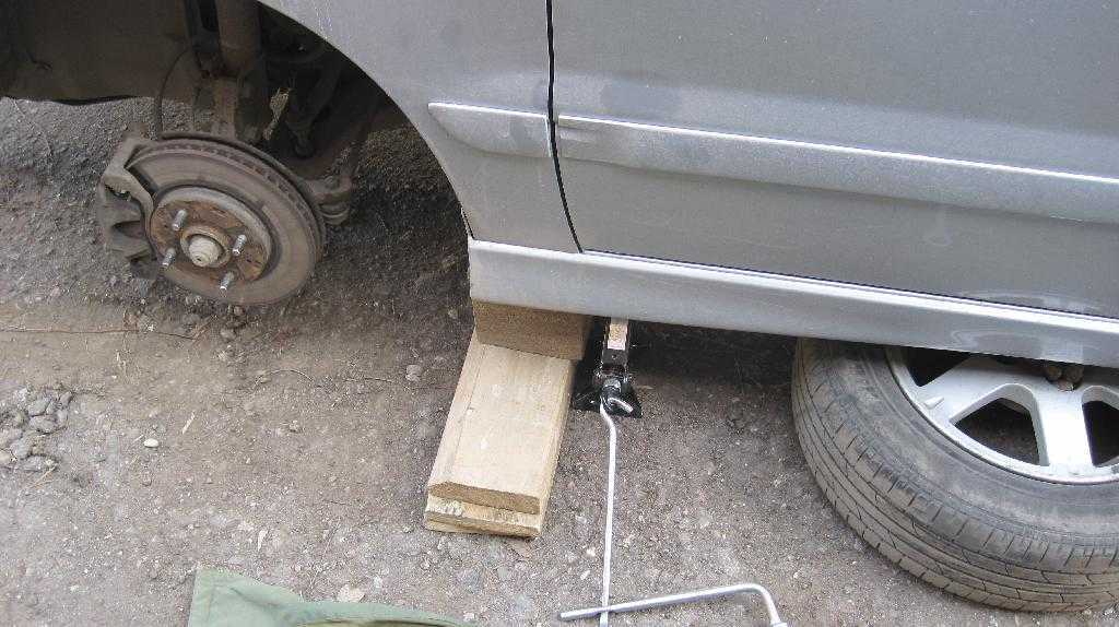 Поднимаем домкратом машину, снимаем колесо. Подкладываем доски, брус под порог и немного опускаем домкрат. Что бы машина «не качалась» на домкрате.