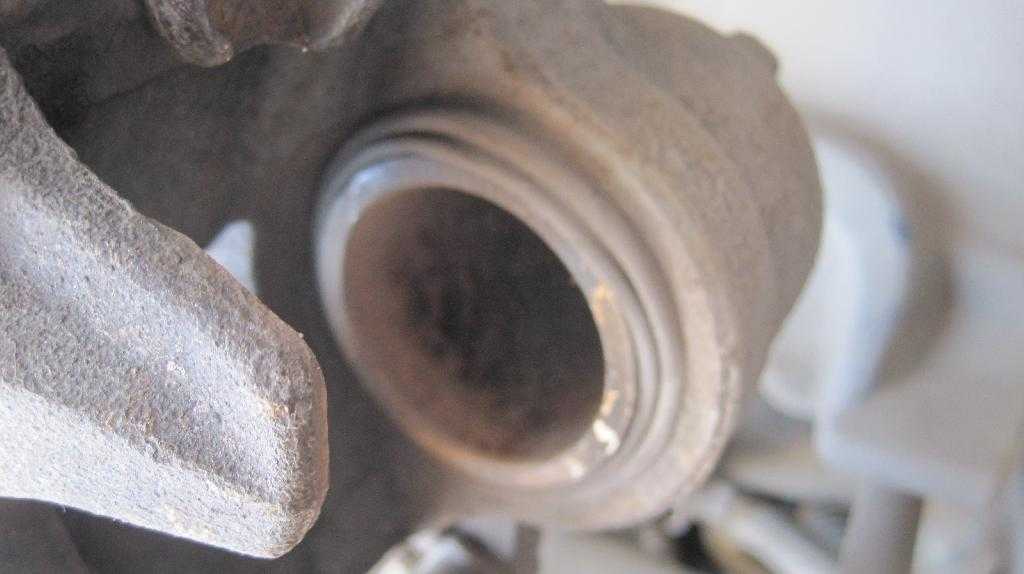По немного он начинает уходить. Смотрим на защитную резинку поршня. Она должна быть без воздуха. Если есть воздух, аккуратно подцепляем резинку и спускаем воздух. На этом суппорте у меня воздуха в резинку не попал.