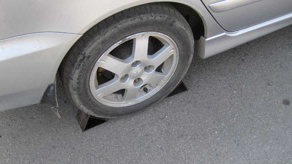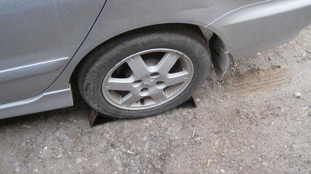 Первым делом, подкладываем под заднее колесо(противоположная сторона от снимаемого переднего) противооткатные упоры.