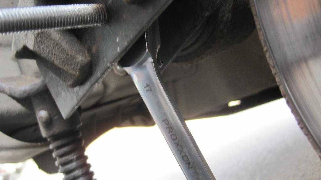 4. С помощью ключа на 17 откручиваем два болта, которые крепят скобу с тормозными колодками. Конечно, можно эту процедуру и не делать, и просто вытащить с помощью плоской отвертки тормозные колодки из пазов вместе пластинками.