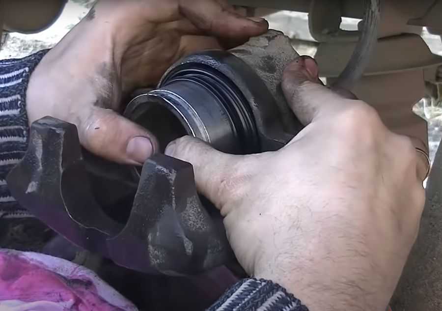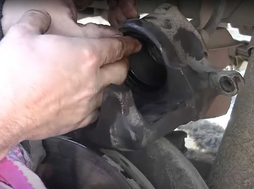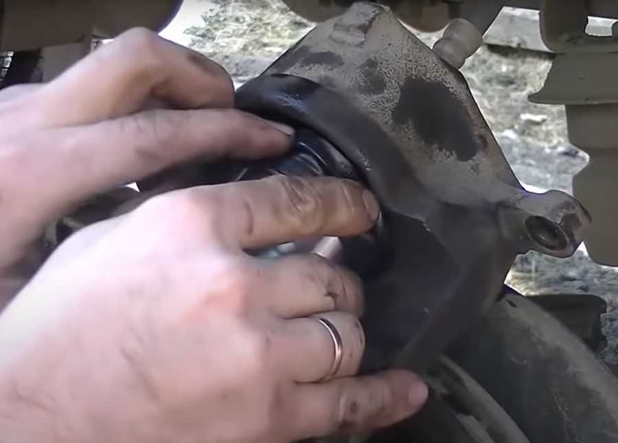 Теперь засовываем кромку пыльника в канавку на суппорте. Это довольно сложно, но возможно