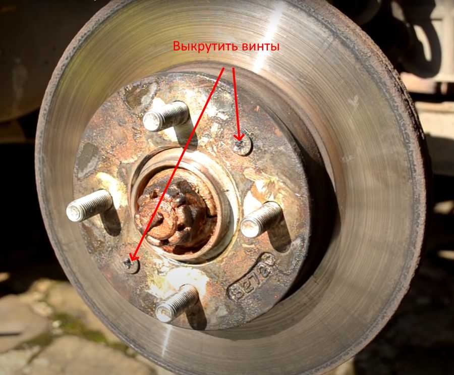 Чтобы снять тормозной диск нужно отвернуть два винта. Если они были сильно затянуты и прикипели, то их шлицы могут срываться при откручивании, поэтому перед их откручиванием рекомендуется нанести по ним удары с помощью отвертки. Ставите отвертку и бьете по ней молотком. После такой операции винты, как правило легко откручиваются, но следует сказать, что отвертка должна быть специальная предназначенная для таких ударов, внутри такой отвёртки должен находиться стальной сердечник.