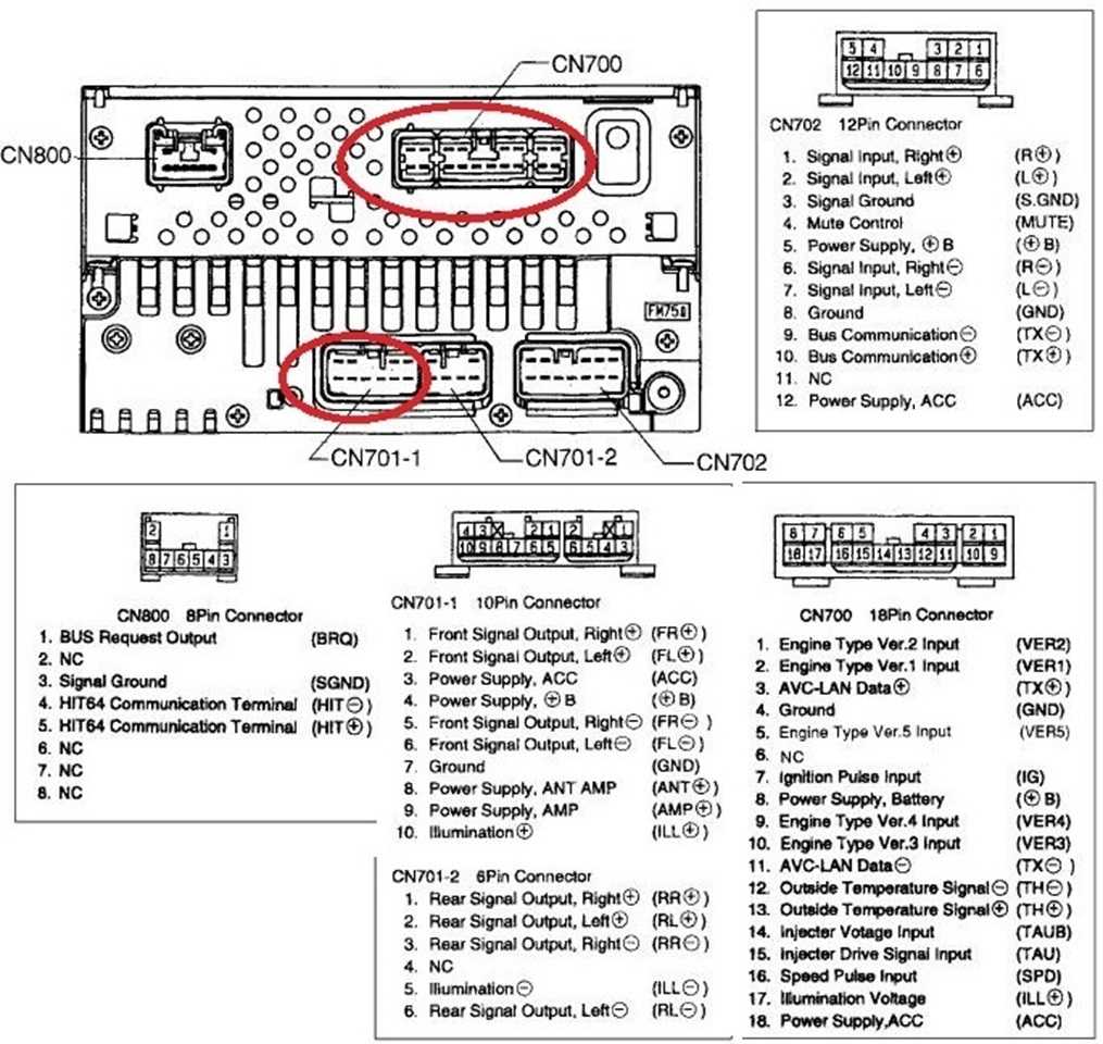 В распиновке предусмотрен 20-контактный разъем, в котором задействованы 4 выхода. Колодка отвечает за коммутацию мультимедийного оборудования к цифровой шине автомобиля. Колодка с 8 пинами предназначена для коммутации внешнего монитора (устанавливается на часть машин, предназначенных для внутреннего рынка Японии).