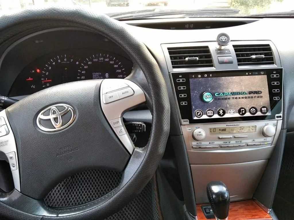 У Тойта Камри 40 заводская акустическая система меняется на более современную автомагнитолу, которая отлично вписывается в интерьер и вместе с головным устройством вполне гармонирует с деталями салона по цвету и качеству отделки. Лишь огромный экран на 10 дюймов преображает машину, явно выделяясь на центральной консоли.