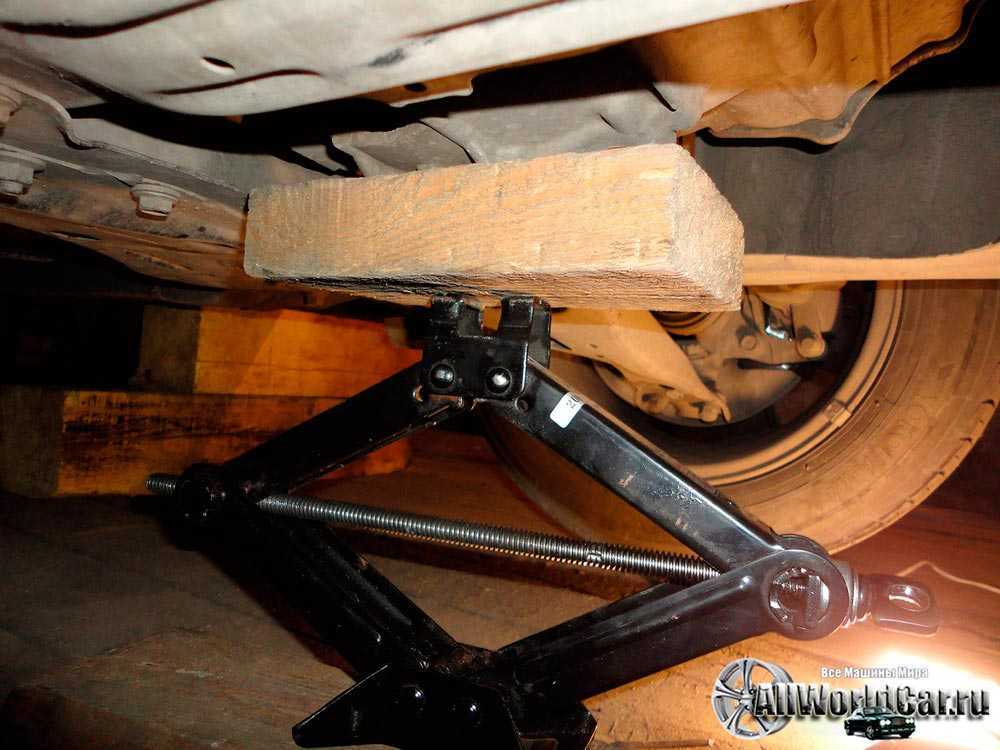 Далее поддамкрачиваем двигатель, я делал упор домкратом через кусок доски в коробку передач. Поднимаем двигатель до тех пор, как сможем шевелить подушку двигателя руками.