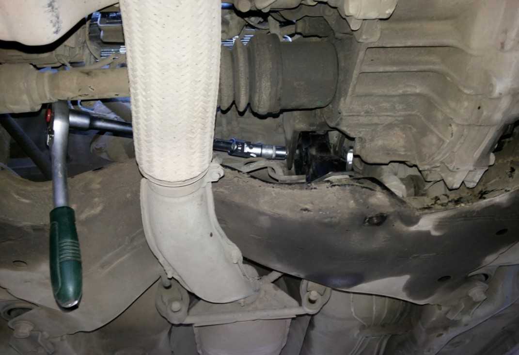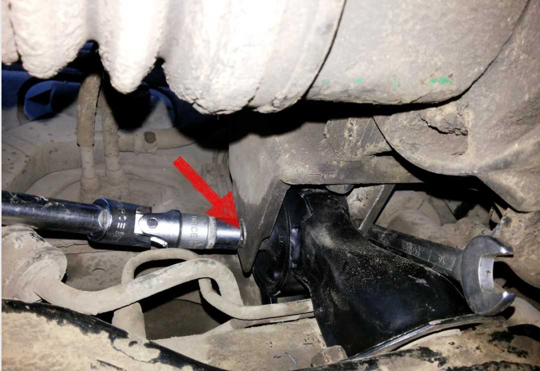7. Последний, правый болт кронштейна задней опоры «срывается» и откручивается накидным ключом «на 17». Операция проводилась снизу автомобиля. Этот крепеж должен демонтироваться последним, потому как требуется подвижность опоры, чтобы выкрутить до конца болт. По другому — никак.