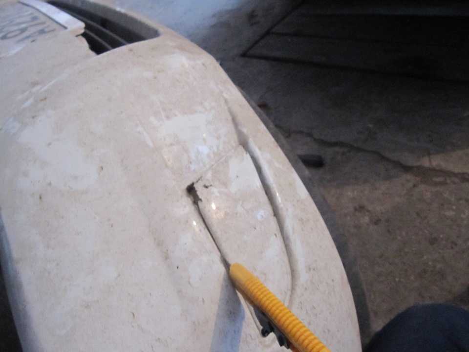 - Просверлите отверстия по периметру, а потом вырежьте острым ножом фрагмент бампера.