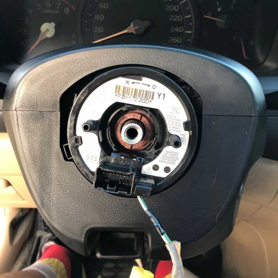 Отсоединяем минусовую клемму от аккумулятора, снимаем на нижней части руля крышку и видим две фишки — на подушку и гудок. Большая желтая фишка снимается хитрым нажатием одной рукой влево и вытягиванием другой вправо.