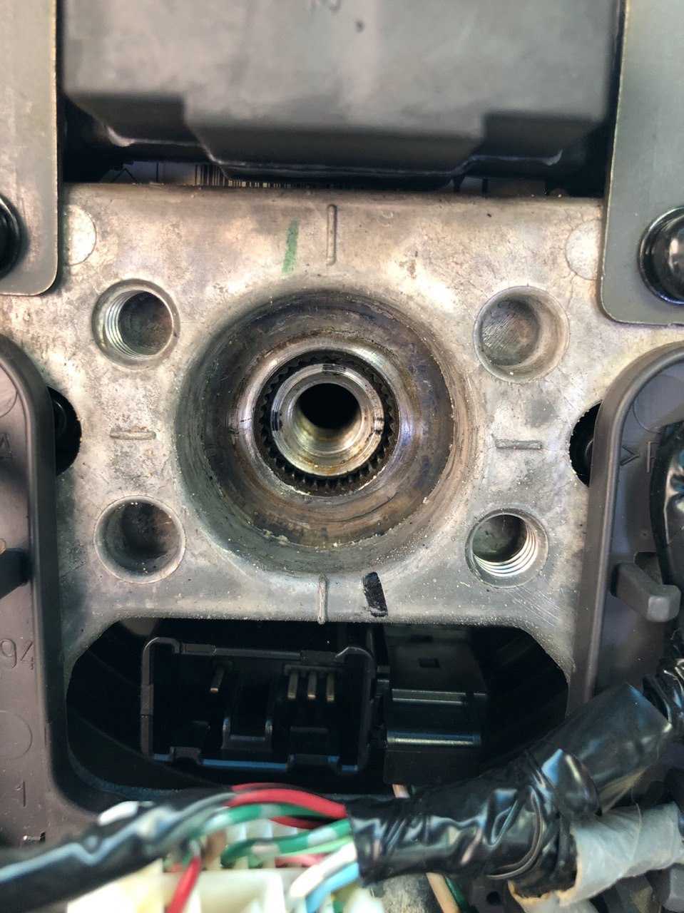 Вывернуть болт крепления рулевого колеса. Обязательно пометить положение ступицы относительно вала колонки. Аккуратно вытащить руль, потянув рулевое колесо на себя, слегка раскачивая его в разные стороны. Установить на его место новое рулевое колесо. Подключить обратно разъемы клаксона. Установить на место модуль подушки безопасности.