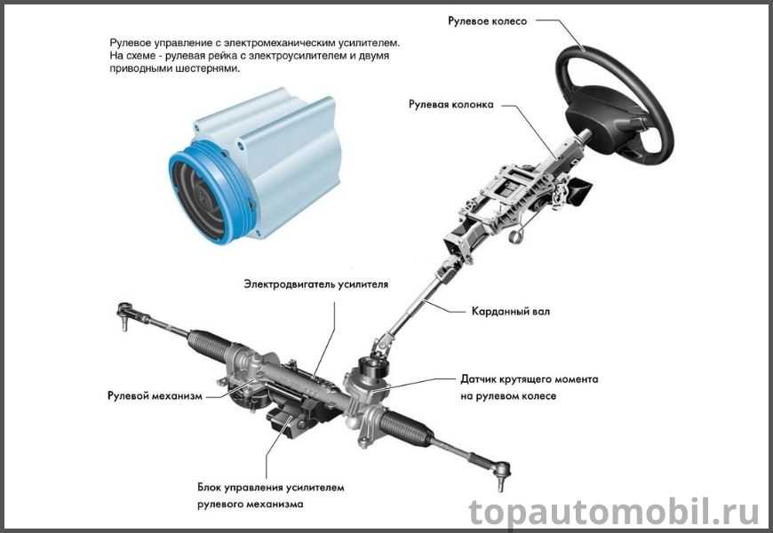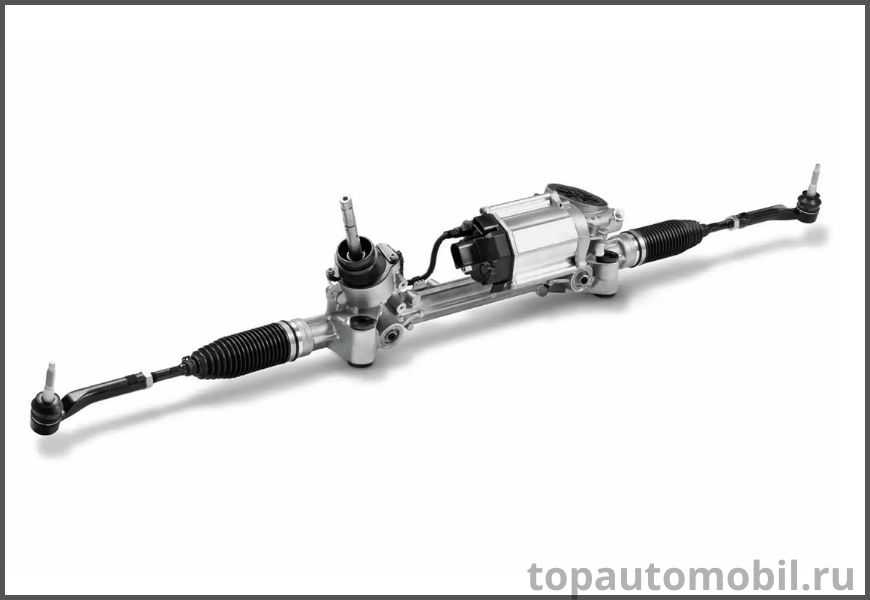 Устройство электрической модели отличается от ГУР тем, что усилителем в этой системе является электродвигатель. Он может быть интегрирован в рулевую колонку, располагаться на валу или совмещен с самой рейкой. Первый вариант самый опасный, так как может привести к полной блокировке руля. Поэтому в дорогих автомобилях применяют третий вариант установки электроусилителя.