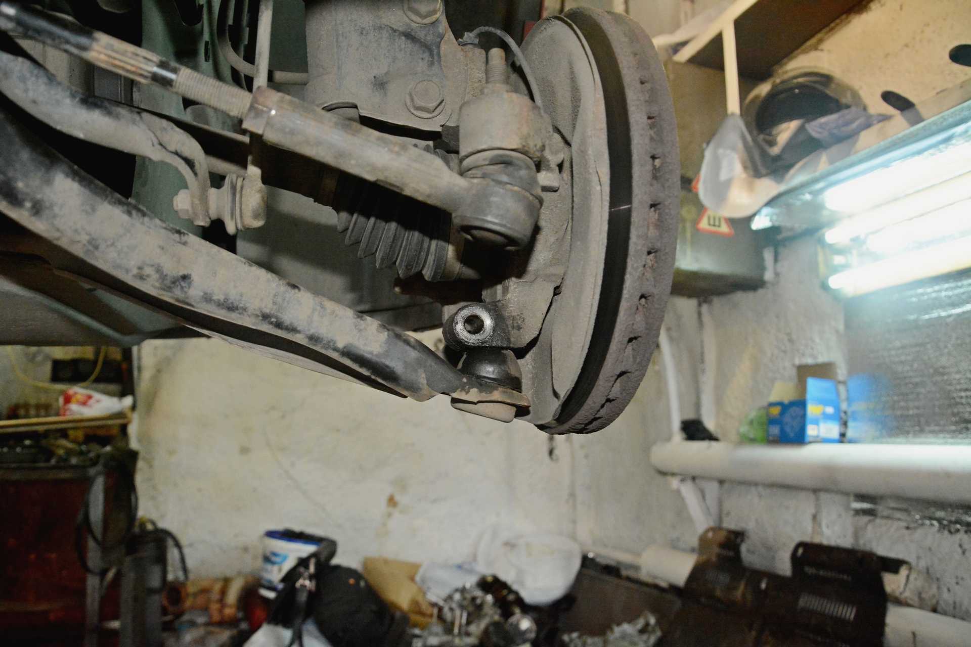 - Забраться под нее и тщательно осмотреть состояние рычажно-шаровой конструкции на каждом колесе.