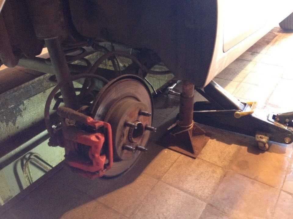 Поддомкрачиваем правую сторону до того, как правое заднее колесо оторвется от земли. Колесо снимать не нужно