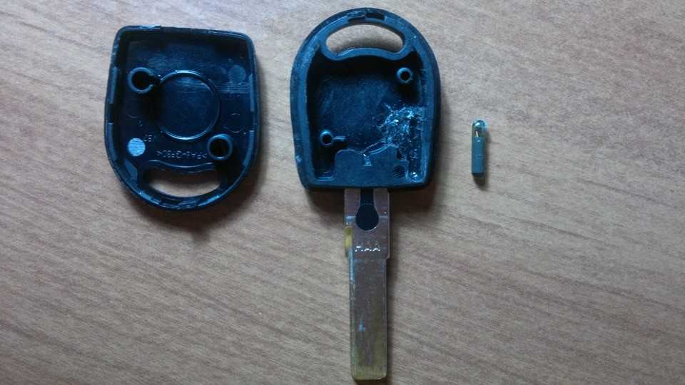 На фото показан разобранный ключ и стеклянный чип иммобилайзера.