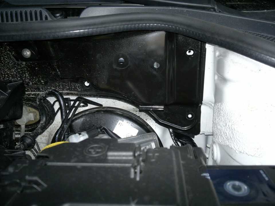 Первым делом устанавливаем под капотом сирену и концевой выключатель. Это удобно сделать в районе правого крыла.