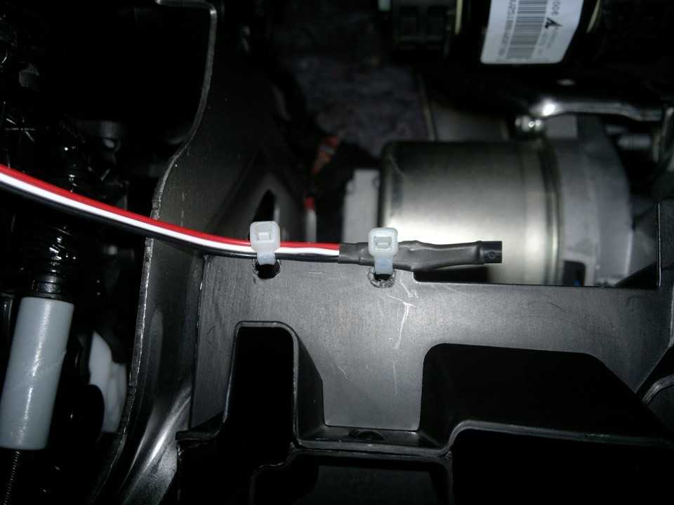 Все электропровода, идущие от сирены, концевика и датчика температуры следует соединить между собой чёрной изолированной лентой и протянуть в салон (через резиновое уплотнение, объединяющее подкапотное пространство и салон):