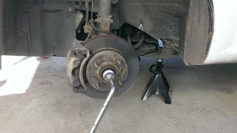 Если на автомобиле использованы легкосплавные колесные диски, то домкратом вывешиваем и снимаем колесо со стороны демонтируемого привода. Лезвием плоской отвертки выправляем замятый поясок гайки подшипника ступицы. Устанавливаем колесо и крепим его гайками.