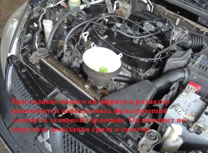— заливаем антифриз аналогичный тому который был в системе (так как с блока двигателя антифриз мы не сливали)