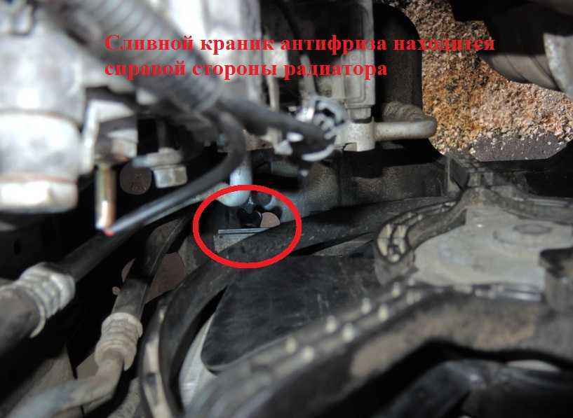 Под радиатором, справой стороны по ходу движения автомобиля находим сливной краник и сливаем антифриз в подготовленную ёмкость.