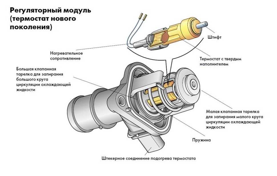 В первом случае термостат функционирует как обычно – степень его открытия зависит от температуры охлаждающей жидкости, которая определяет вязкость и объёмы воскового шарика, оказывающего давление на большую клапанную тарелку. При воздействии на нагревательный элемент электрического тока, посылаемого под контролем бортового компьютера – его наполнитель начинает плавиться, что способствует открытию клапана и направлению части жидкости по большому кругу.