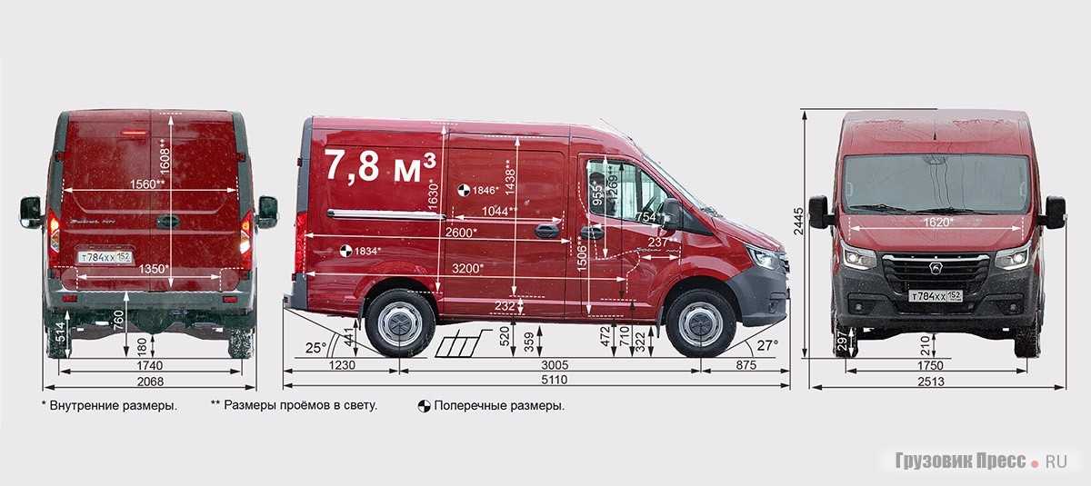 Габаритные размеры автомобиля в мм – 5110х2068х2445,колёсная база 3005 мм,объём грузового отсека 7,8 куб.м,размеры грузового отсека в мм – 2600х1830х1630,расстояние между колесными арками 1350 мм позволяет вместить 3 стандартных европоддона,погрузочная высота 760 мм.